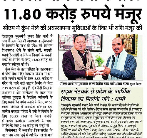उत्तराखंड में विकास योजनाओं के लिए ₹11.80 करोड़ मंजूर, कुंभ मेले की अवस्थापना सुविधाओं को मिलेगा बढ़ावा